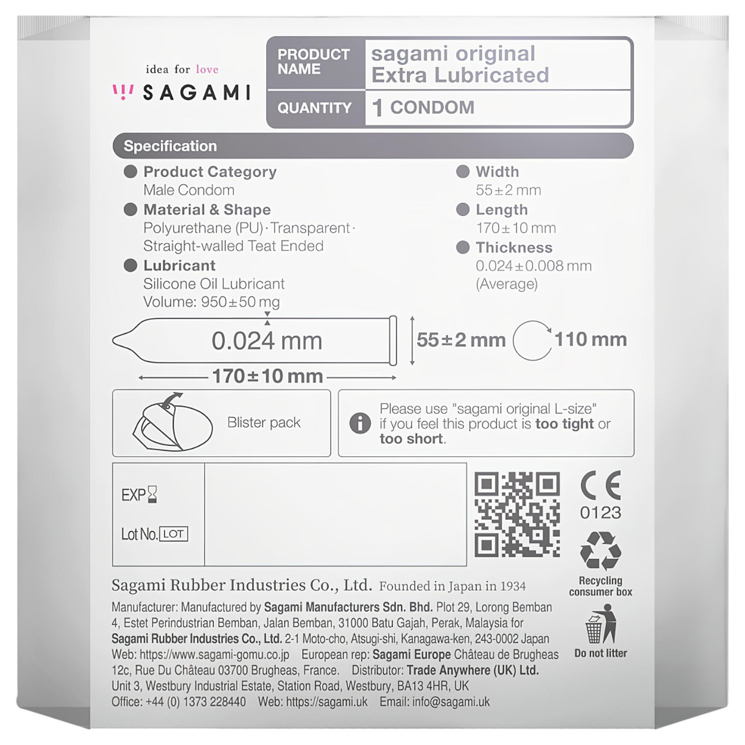 • 1 unidade de Sagami Original 0.02 - extra lubrificado preservativo (55 mm)